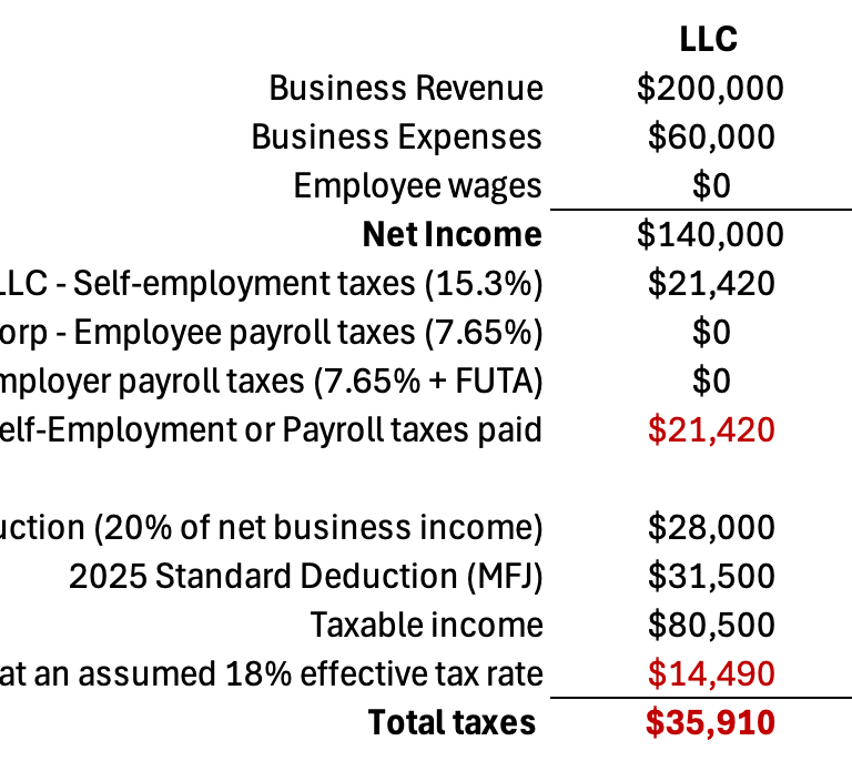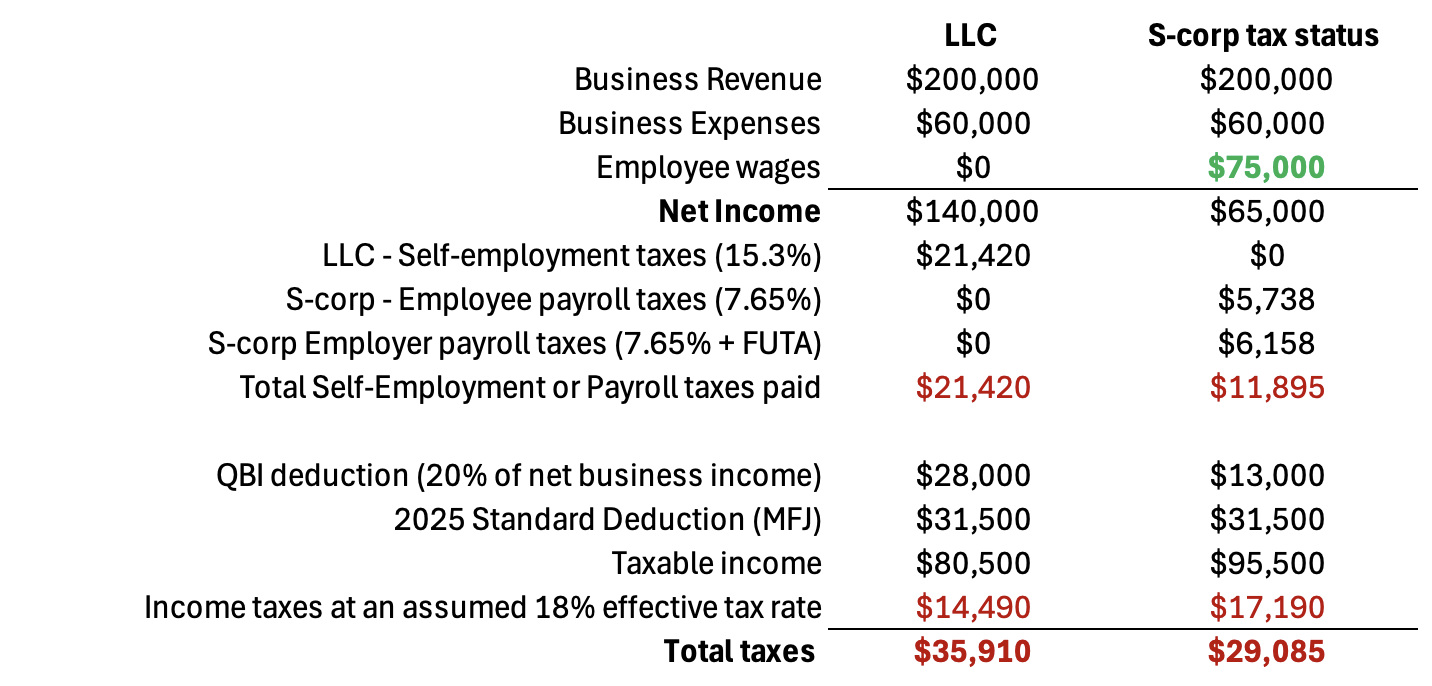 Here is a simplified example comparing the total tax paid between an LLC and an S-corp: